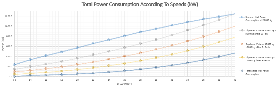 On the graph, the curve at the top shows standart hull power consumption at 20000kg. The following are respectively 15000kg, 10000kg, 5000kg and totally flight position with hydrofoiled configuration according to speeds.